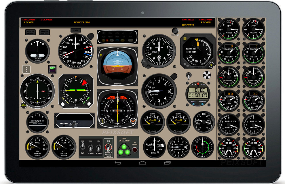 Glasscockpit with EIS (Engine Information System) for Android devices to link with external simulators like Microsoft Flight Simulator, Lockheed Prepar3D and X-Plane. Includes 30+ predefined aircraft types.